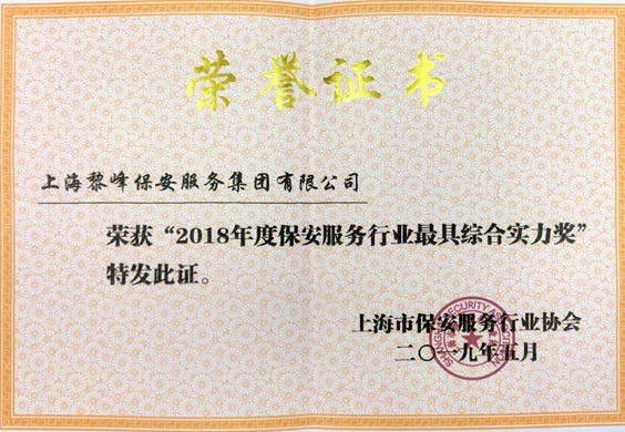 2018年10月 榮獲上海市公安局頒發(fā)的“保安服務(wù)行業(yè)綜合實(shí)力企業(yè)獎(jiǎng)”